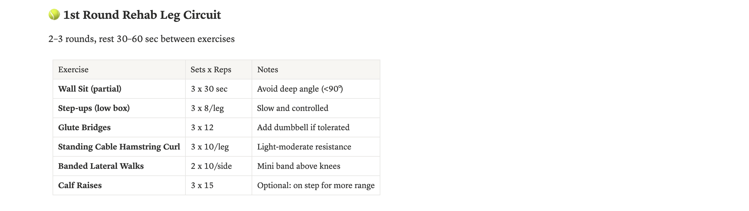 Two dedicated rehab leg days per week, built around exercises that load the knee safely — wall sits, step-ups, glute bridges, hamstring curls, and banded lateral walks. No deep squats, no lunges past 90 degrees, no twisting or pivoting until much later in the process.